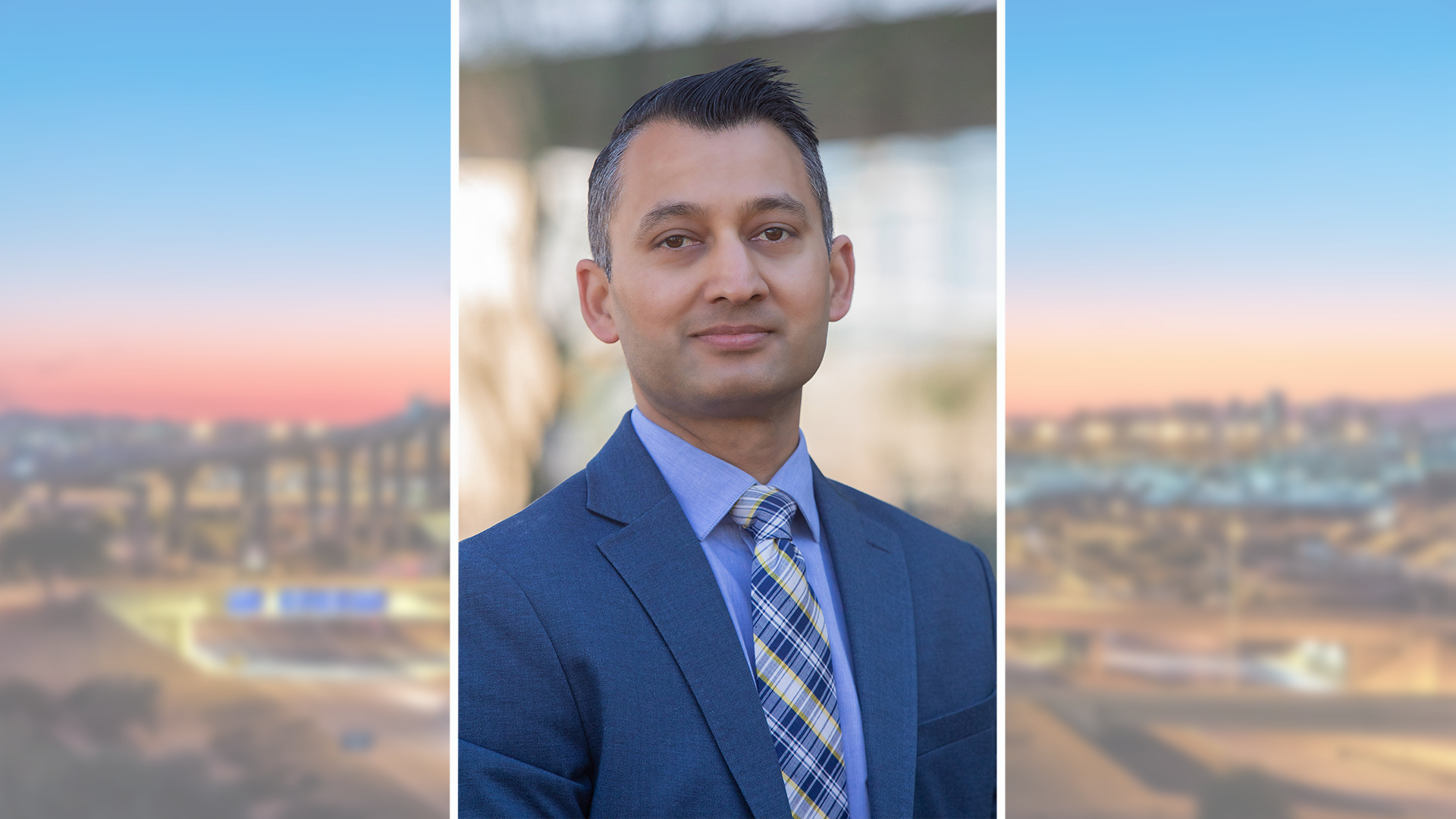 A wide shot of the exterior of Phoenix Sky Harbor International Airport, lit up against a blue and orange sky at dusk.