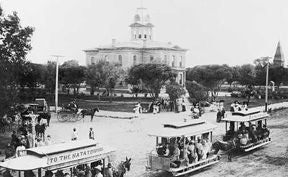Horse-drawn streetcars pass by the old courthouse in the 1890s.