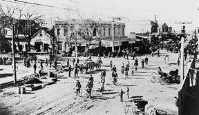 Cyclists add to the heavy traffic at Washington and First streets in the late 1880s.