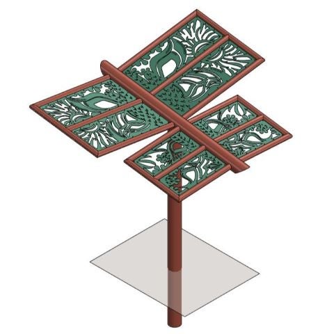 Three local artists collaborated with the design team to contribute artwork that reflects the culture and heritage of our City. The artist designs are reflected in the cut-outs on the shade panels that are attached to the structures and in the choice of colors for the structures.