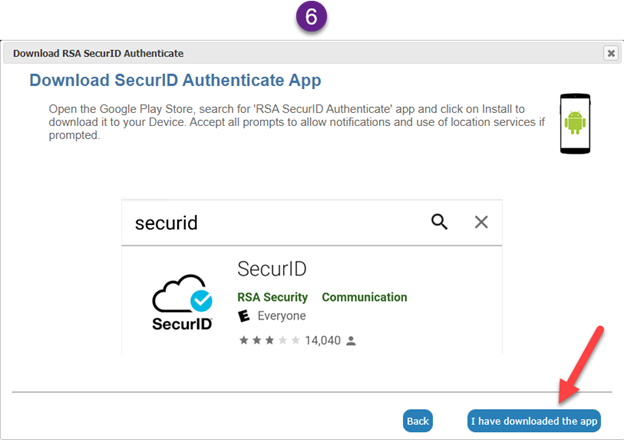 5. Select iOS or Android. Download and install the RSA Authenticator (SecurID) app from the Apple App Store or Google Play Store. We will refer to this app as "SecurID" from here forward. Accept the prompt to allow notifications. You can choose to enable or disable anonymized data, including location data. Disabling data collection does not impact the functionality of the SecurID app.