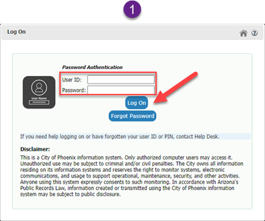 1. Open a web browser on your laptop and go to https://pwreset.phoenix.gov. Enter your employee ID and computer password. Click Log On.