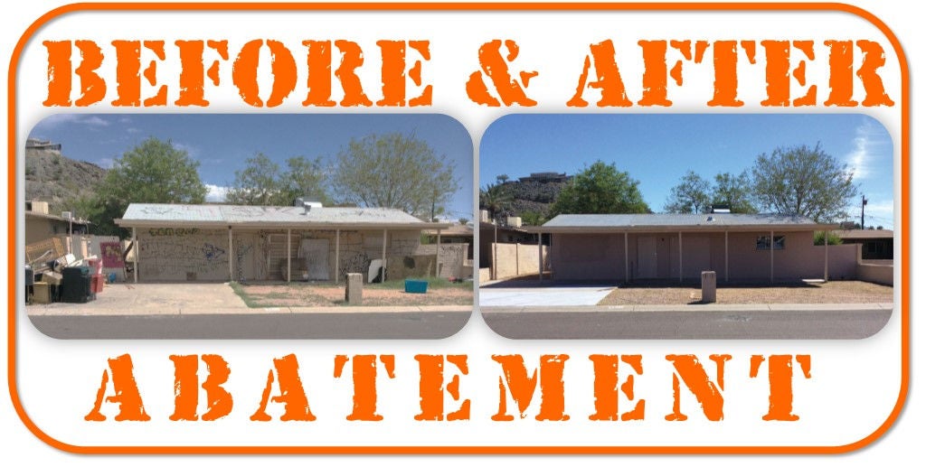 Before and after photo of a neglected property that is abated and becomes a nice livable home