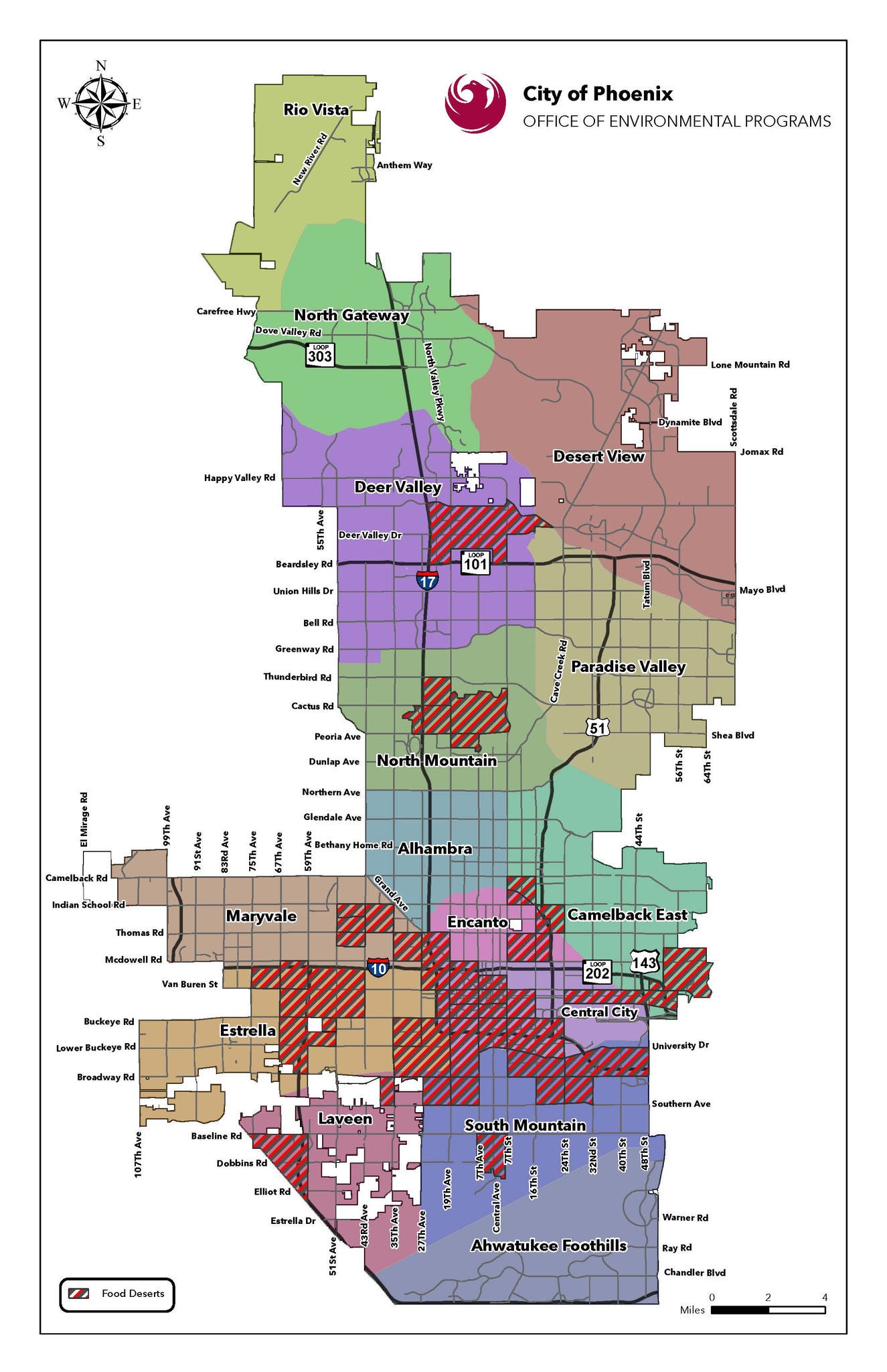 MAP OF FOOD DESERTS IN PHOENIX: The striped boxes on the map to the left indicate food deserts in Phoenix, specifically, areas where residents must travel 1 or more miles to a grocery store or other supplier of fresh produce. One mile may not seem like a lot but food deserts mainly occur in low-income areas where not all residents have a vehicle, making transportation an added challenge.
