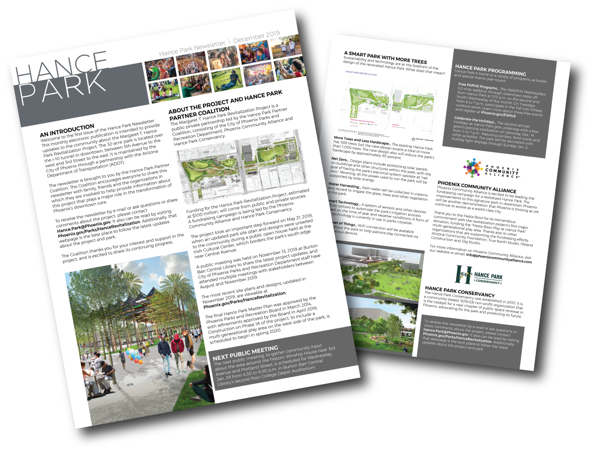 The Margaret T. Hance Park Revitalization Project is a public-private partnership led by the Hance Park Partner Coalition, consisting of the Phoenix Parks and Recreation Department, Phoenix Community Alliance and Hance Park Conservancy.