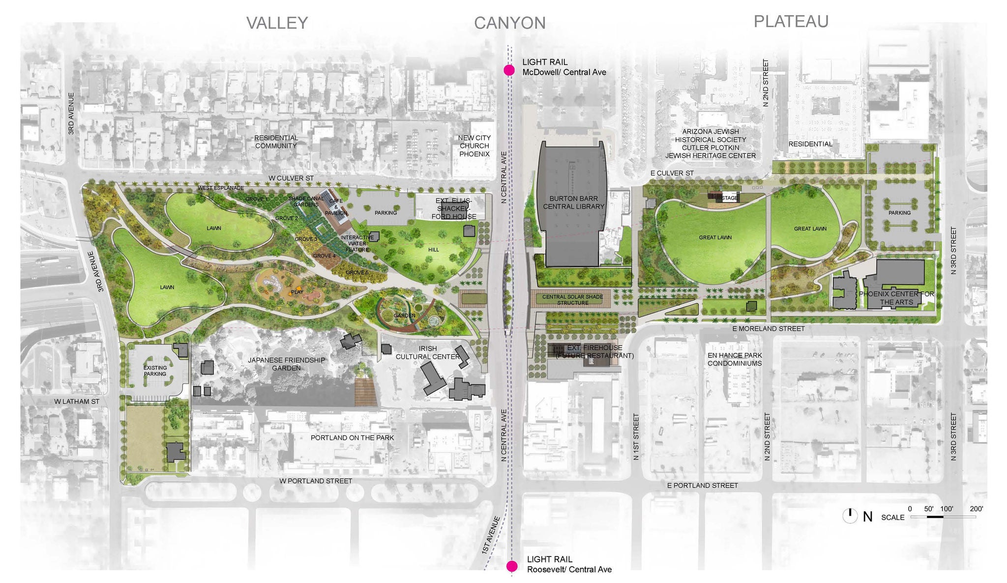 The site plan shown above was updated in December 2020. The final Hance Park Master Plan was approved by the Phoenix Parks and Recreation Board in March 2014, with refinements approved by the Board in April 2016.