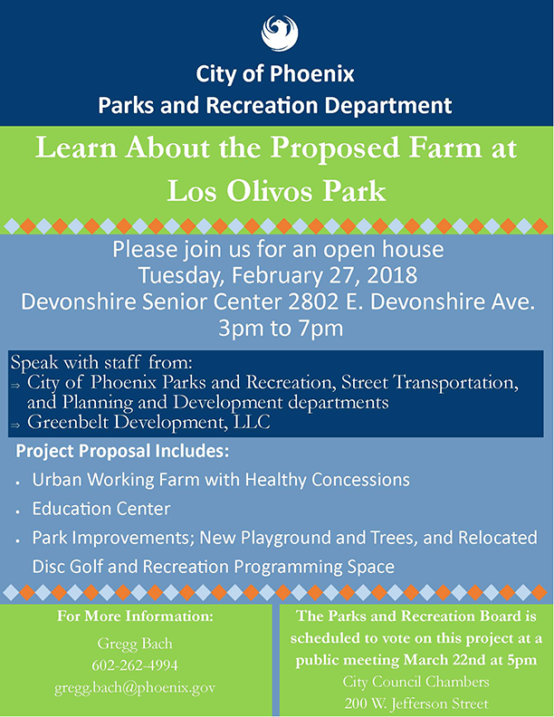 For Further Information Contact. The Phoenix Parks and Recreation is hosting a website where the EA and other project materials will be available. Additional information can be found at Phoenix.gov/Parks/Los-Olivos-Park.