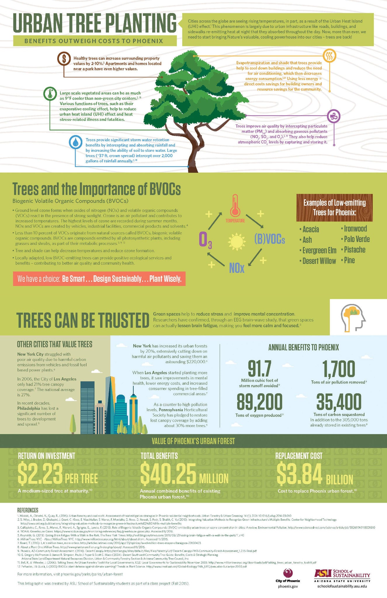 Arizona State University and the forestry team have worked together to illustrate the importance of Urban Tree Planting and to share their findings that both the financial, environmental, and social benefits of planting the right trees in the urban environment will greatly outweigh the cost of the tree planting and maintenance.