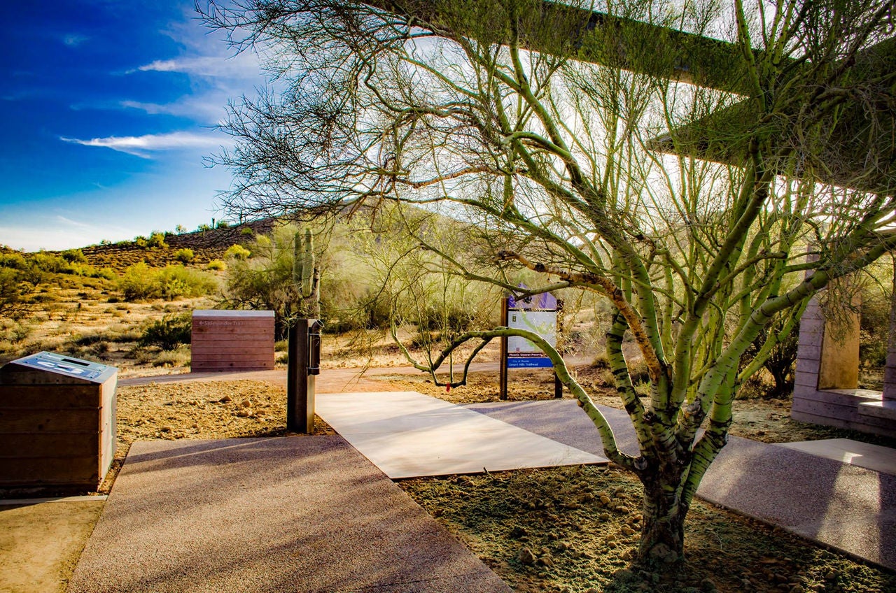 A tree, cactus, trailhead information, and shaded areas are visible in Sonoran Preserve.
