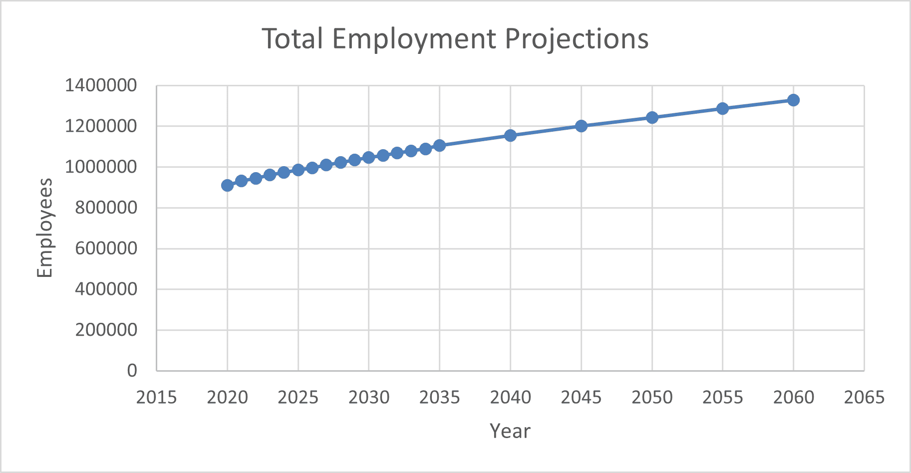 The following graphs shows the projections for population and employment from the Growth Projections and Land Use Assumptions 2024 Update completed by Applied Economics.