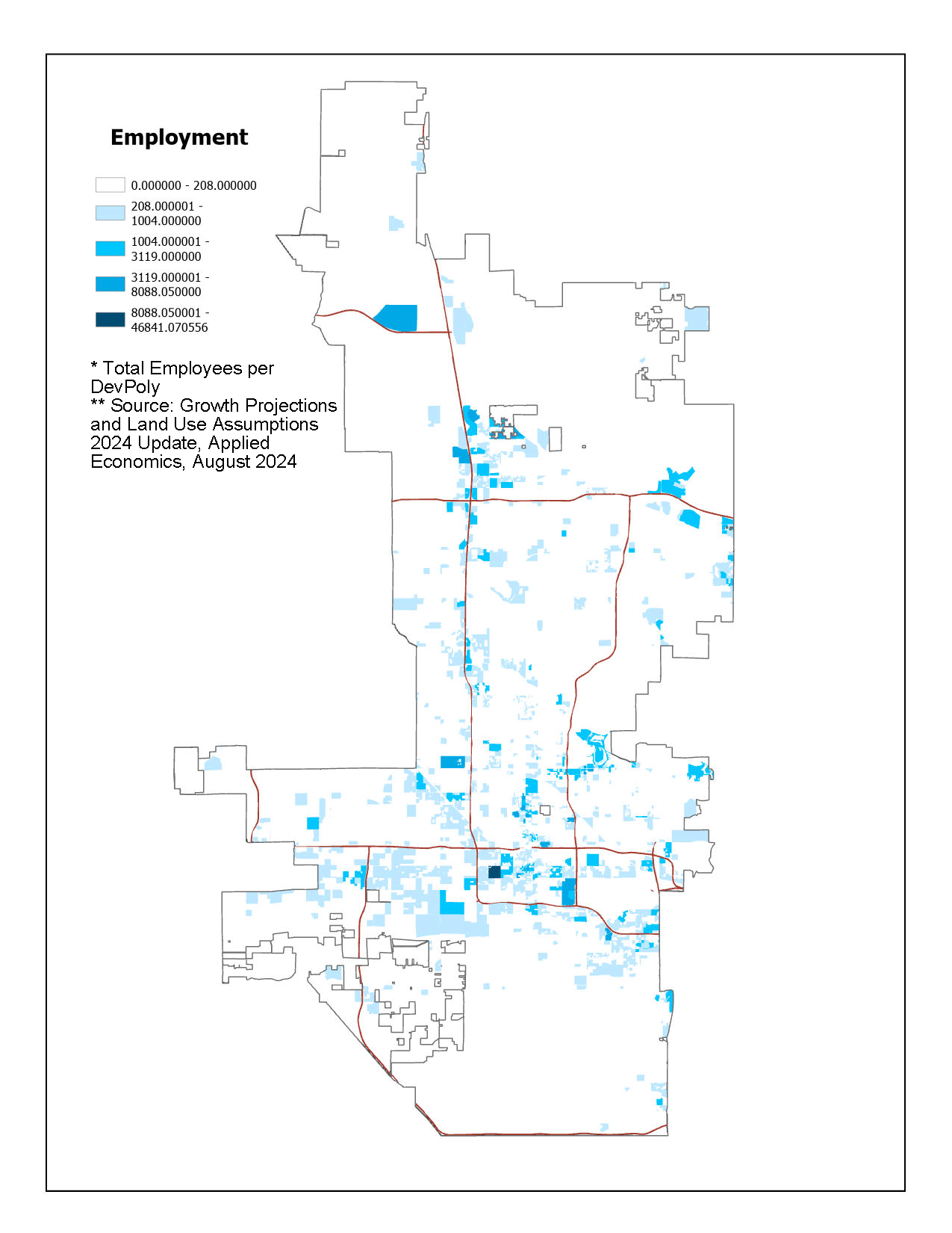 The following maps show the 2026 density of population and employment from the Growth Projections and Land Use Assumptions 2024 Update completed by Applied Economics. Study can be found here: Growth Projections Study 2024.