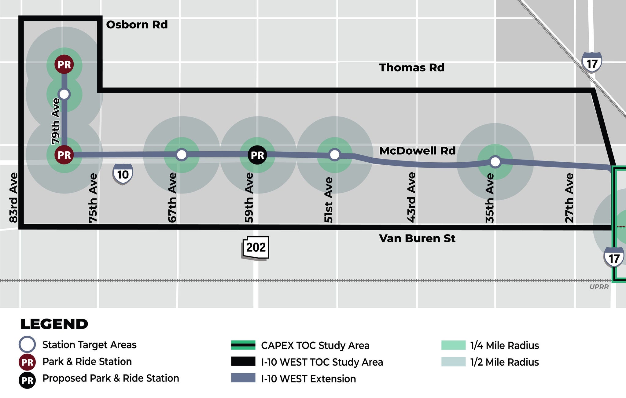 The I-10 West TOC Study Area is defined broadly by Interstate 17 on the east, 83rd Avenue on the west, Van Buren Avenue on the south, Encanto Boulevard on the north, and extending to Osborn Road between 75th Avenue and 83rd Avenue. The Capitol Extension TOC District has its own website which can be found here: https://www.phoenix.gov/pdd/tod/Capitol.