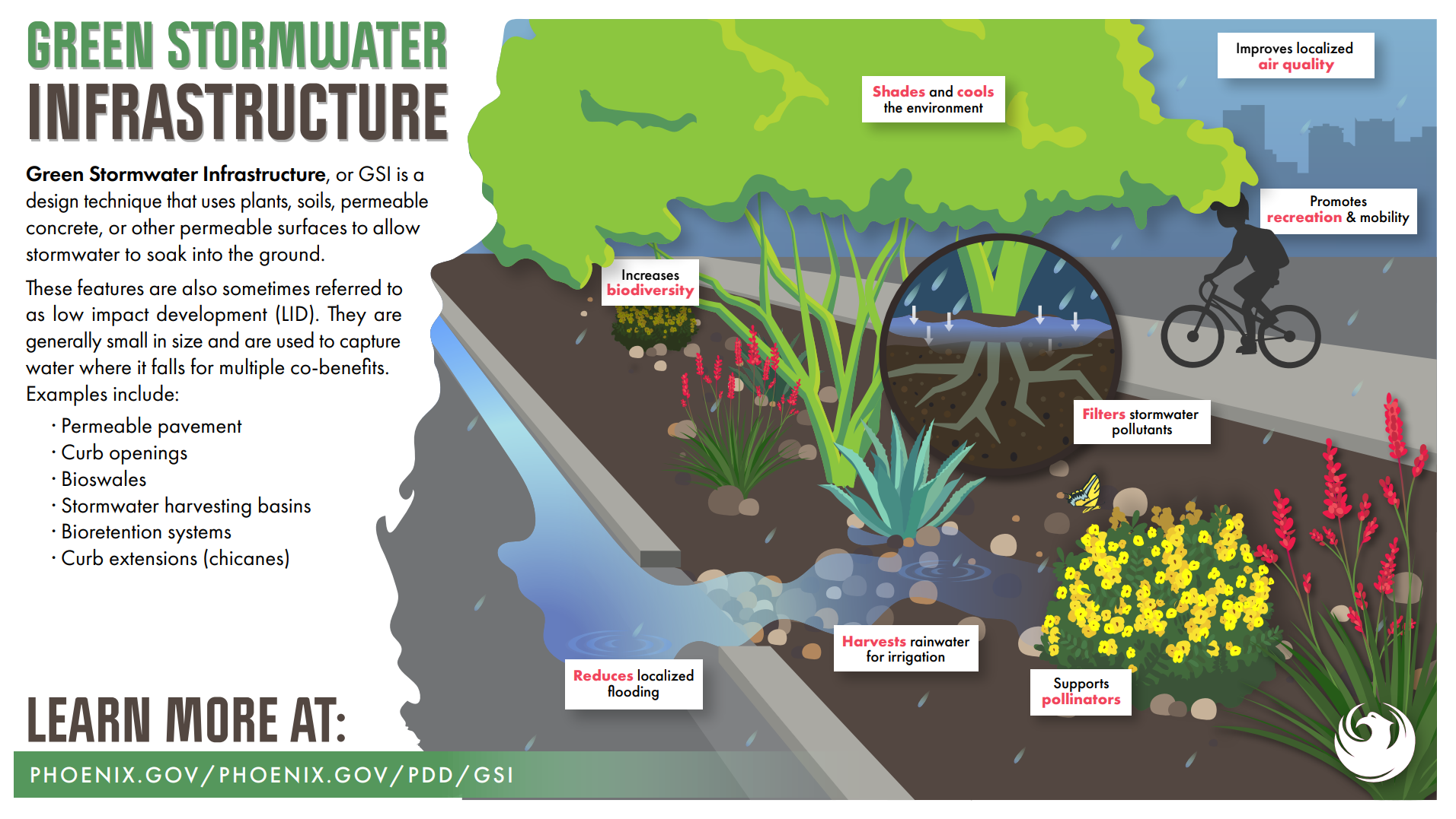 Visit these sites and documents to see how you can incorporate GSI into your projects and on your property and to learn more about GSI in the City of Phoenix.