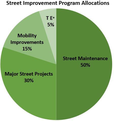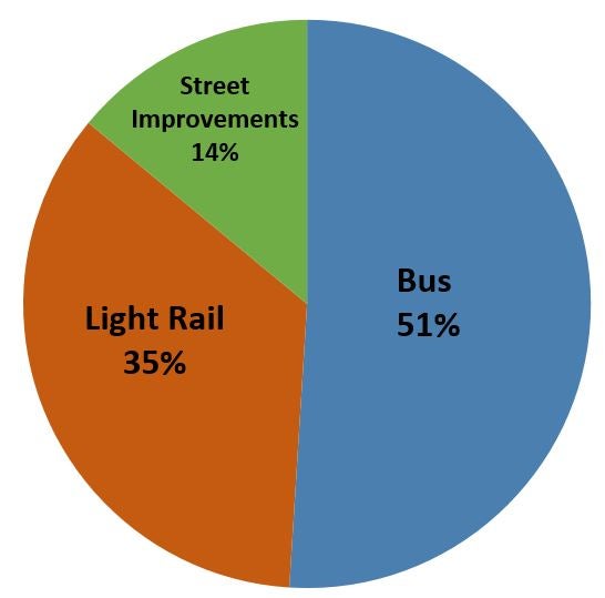 Fourteen percent of the revenues generated by the Transportation 2050 sales tax are dedicated for street improvements (green pie chart). More than $2.3 billion is projected for street improvements over a 35-year period from 2016 through 2050.