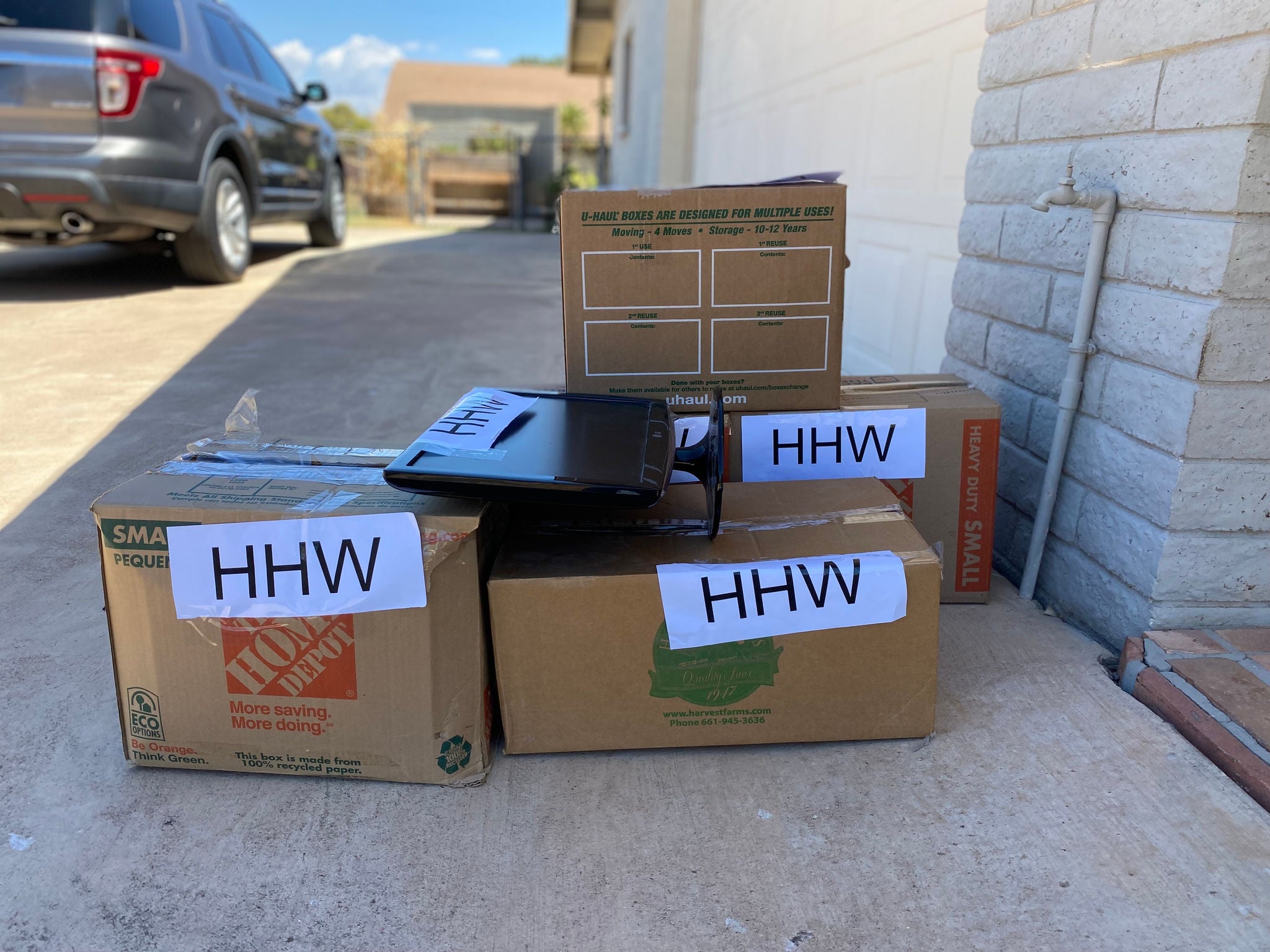 - Placement: Please ensure the box of items is placed outside next to your garage or front door, clearly visible and accessible to staff. DO NOT place any HHW at the curb, in the street or on the sidewalk.