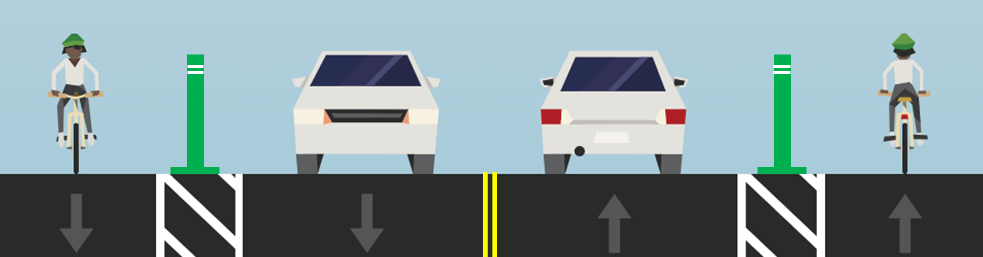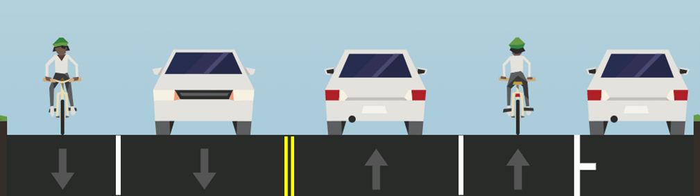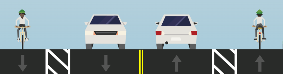 Bike lanes add space between people driving and people walking or biking for increased protection from vehicles, improved safety and added comfort. Additionally, the slight narrowing of the lane widths to accommodate bike lanes will help to guide cars and deter speeding.