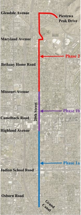 Phase 1B includes the 20th Street segment from Highland Avenue to Missouri Avenue and recommends bike lanes, buffered bike lanes, protected bike lanes and a shared use path where appropriate. Phase 2 includes the 20th Street segment from Missouri Avenue to Glendale Avenue, and then Glendale Avenue from 20th Street to Ocotillo Road. Shared Lane Markings (“sharrows") are recommended on this segment, which will assist users in reaching the Piestewa Peak Trail network.