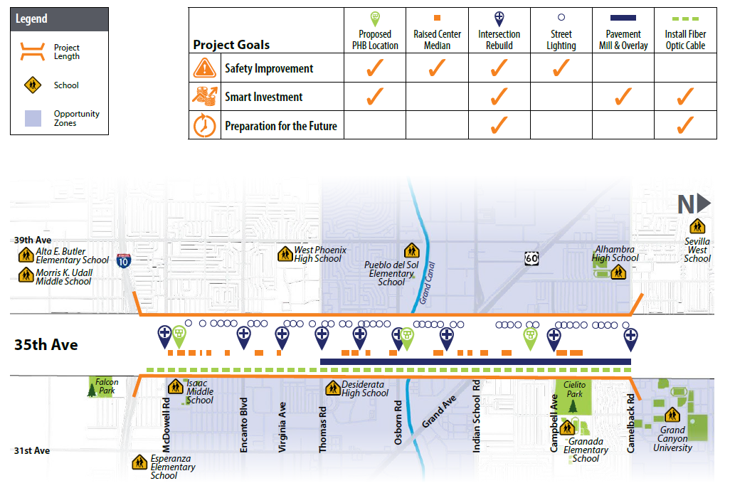 The 35th Avenue Safety Corridor Project consists of improvements that advance safety, mobility and economic development in the project area. Targeted improvements include: