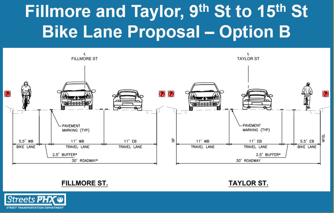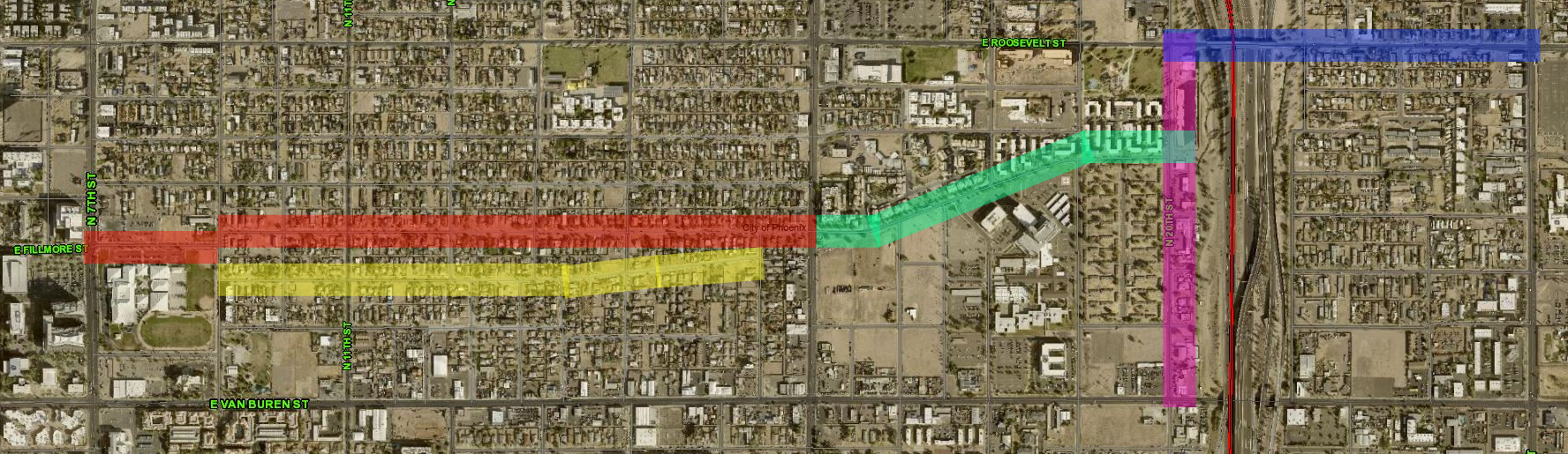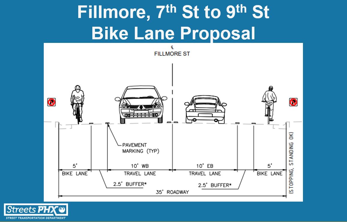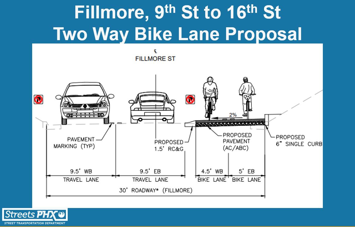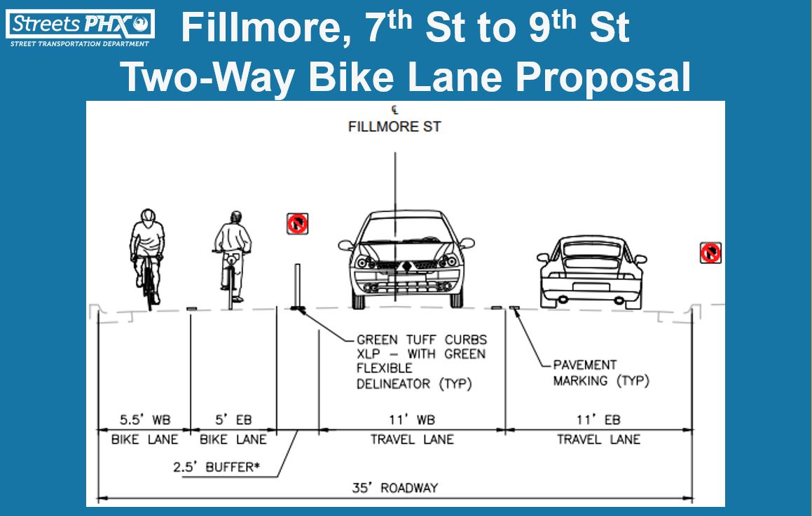 The project has expanded to further create more biking structures in the area, expanding from Van Buren Street to Roosevelt Street. The team has looked at several options, which are viewable below in greater detail. Additionally, another bike project is being proposed along Fillmore Street from Central Avenue to 7th Street.