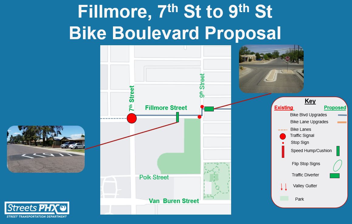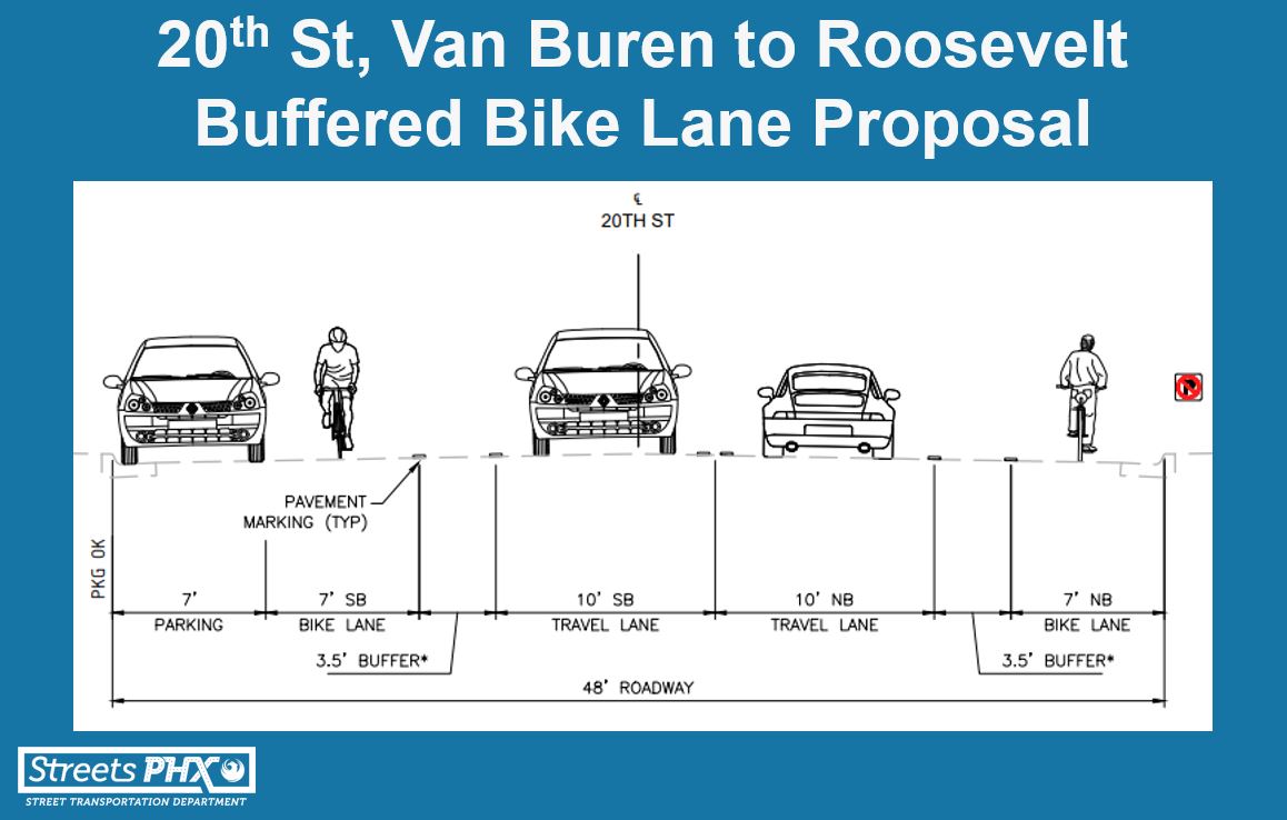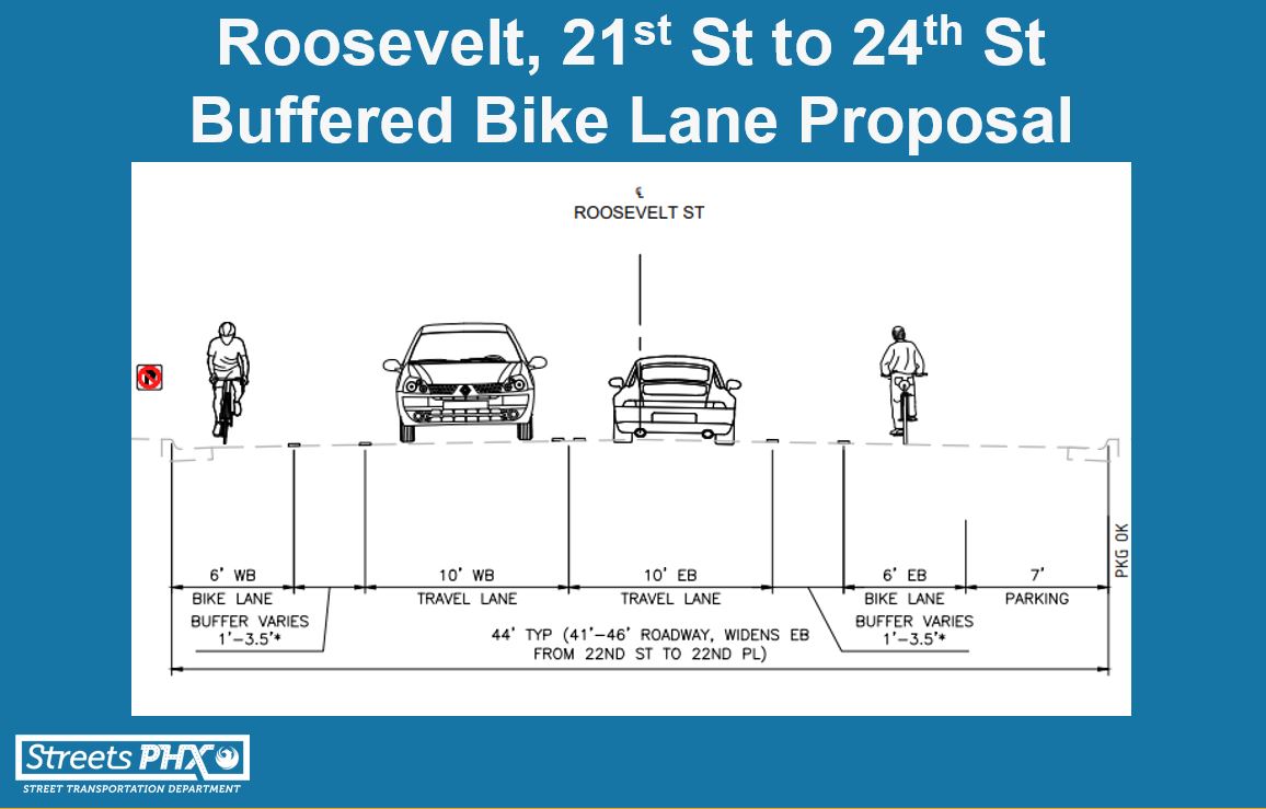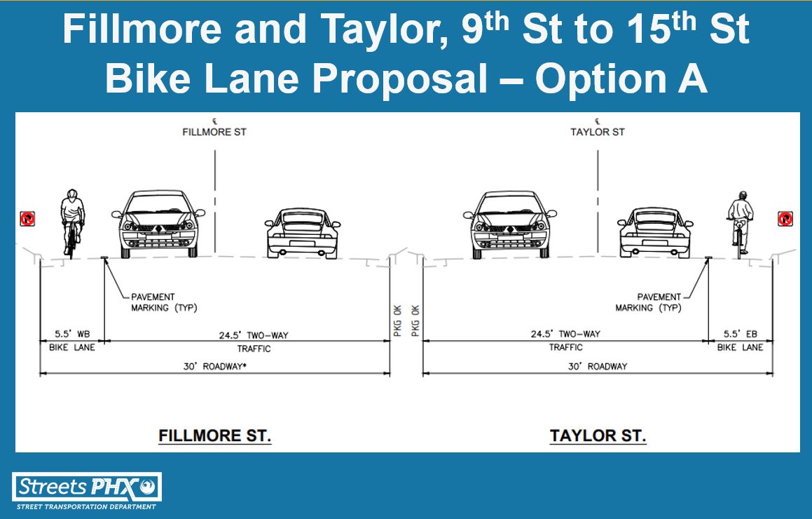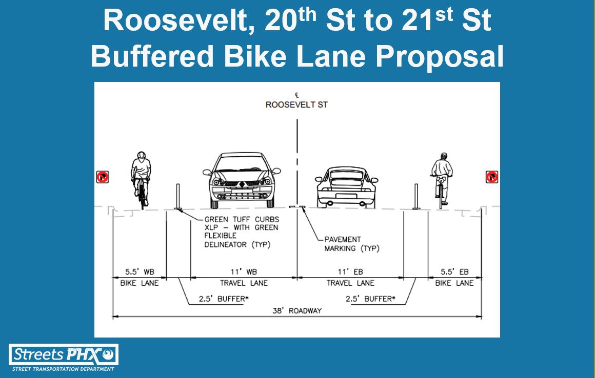 The project has expanded to further create more biking structures in the area, expanding from Van Buren Street to Roosevelt Street. The team has looked at several options, which are viewable below in greater detail. Additionally, another bike project is being proposed along Fillmore Street from Central Avenue to 7th Street.