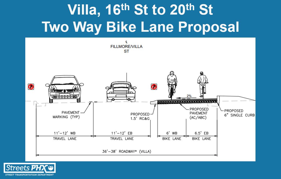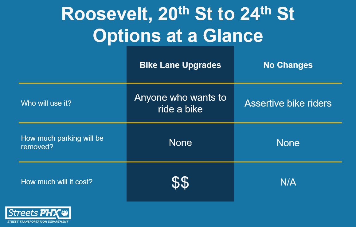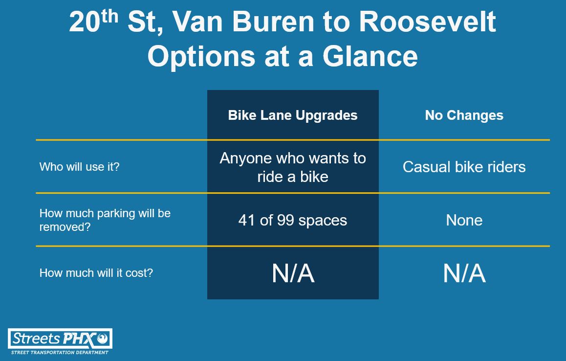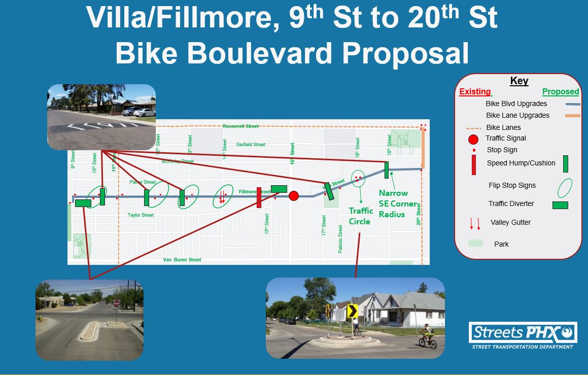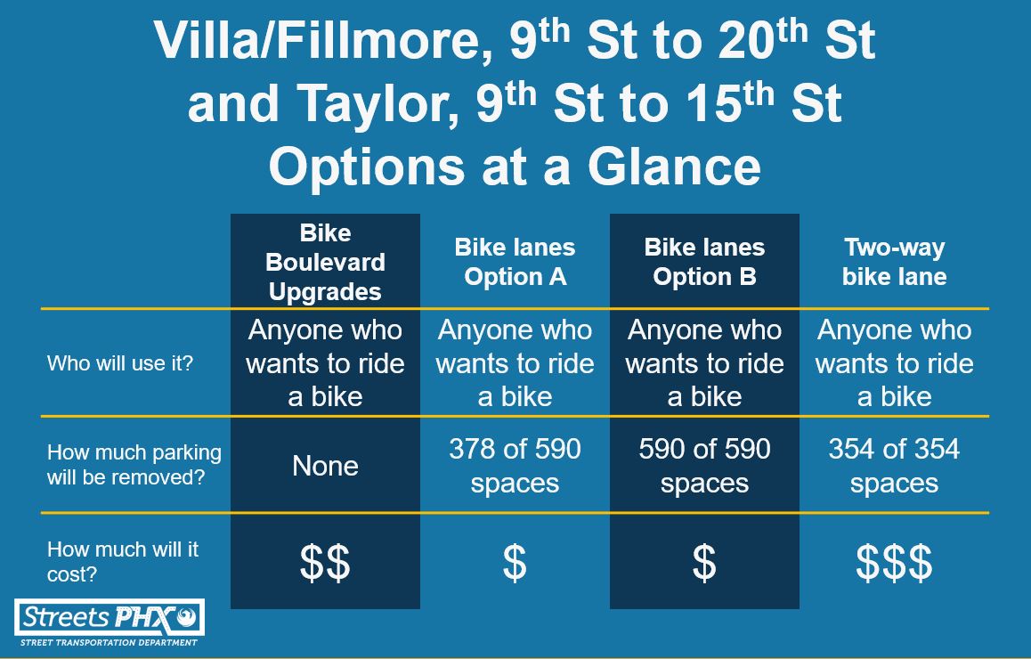 The project has expanded to further create more biking structures in the area, expanding from Van Buren Street to Roosevelt Street. The team has looked at several options, which are viewable below in greater detail. Additionally, another bike project is being proposed along Fillmore Street from Central Avenue to 7th Street.