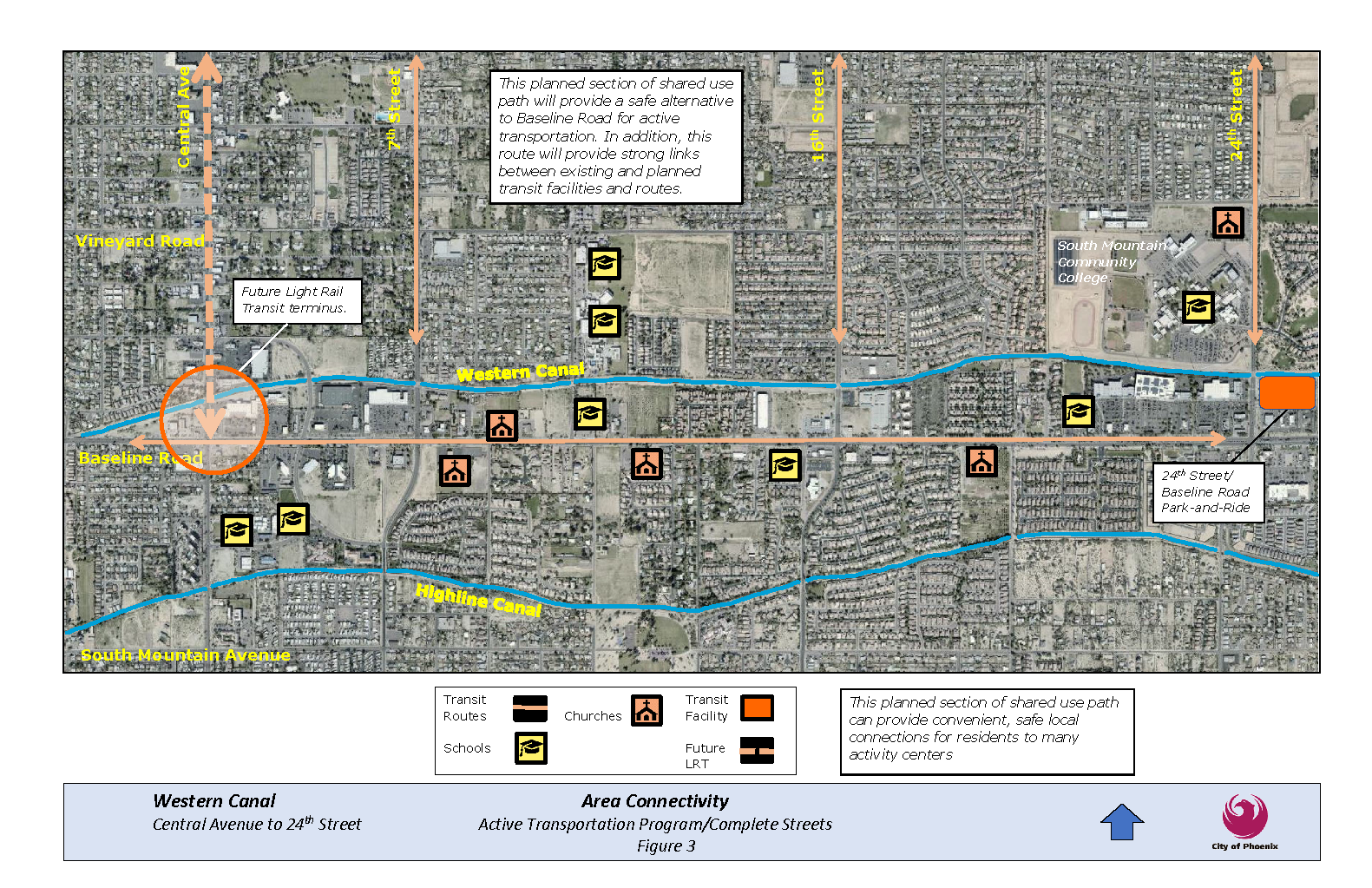 The project will link neighborhoods with eight schools, four transit routes, a park-and-ride facility, five churches and the future Valley Metro South Central Light Rail extension. Scroll down to view a project area map.