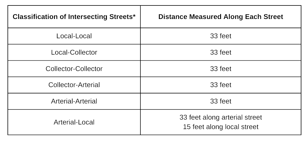 At public street intersections in residential areas, there shall be no fence or wall or hedge higher than three (3) feet, nor any obstruction to vision other than a post or column or tree not exceeding one (1) foot in diameter between a height of three (3) feet and ten (10) feet inside the triangular area formed by the lot lines at the following distances from the point of their intersection. (See sample diagram.)