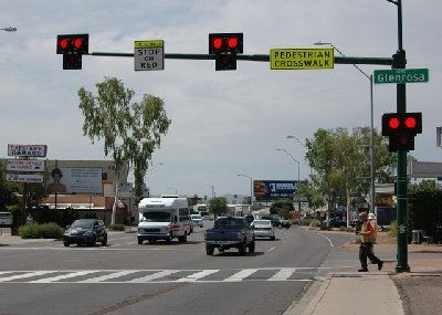 HAWK signal at a busy intersection ensures pedestrian safety.