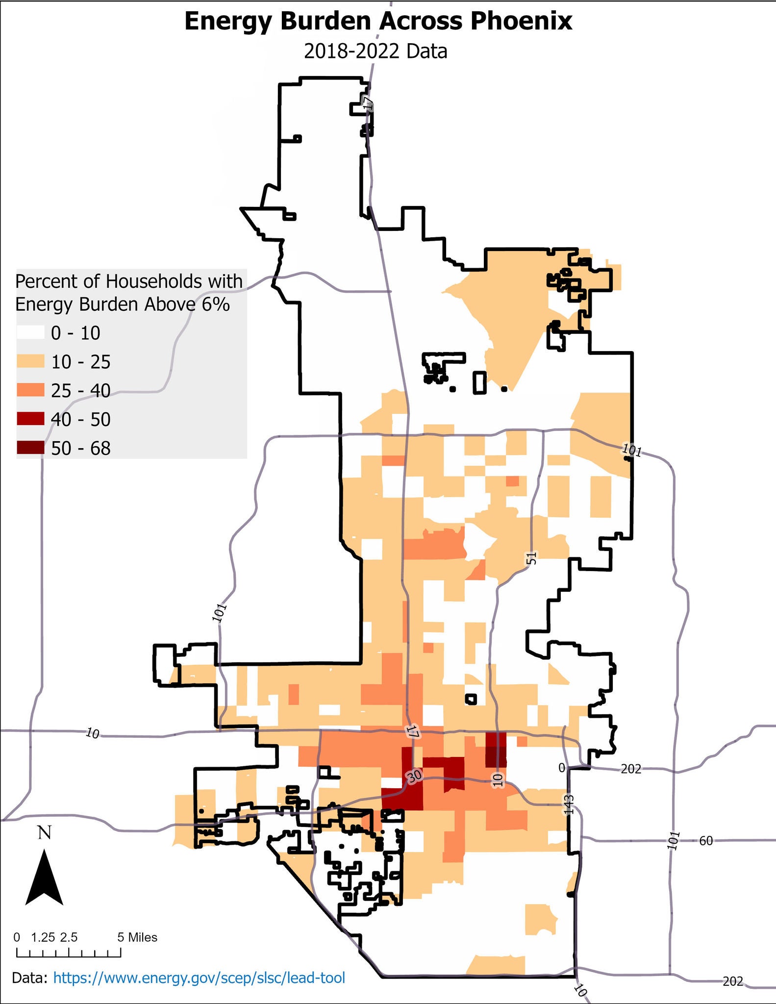 The following maps show the percentage of low-income households that are experiencing high (yellow) and severe (blue) energy burden in the Phoenix Metropolitan Area.