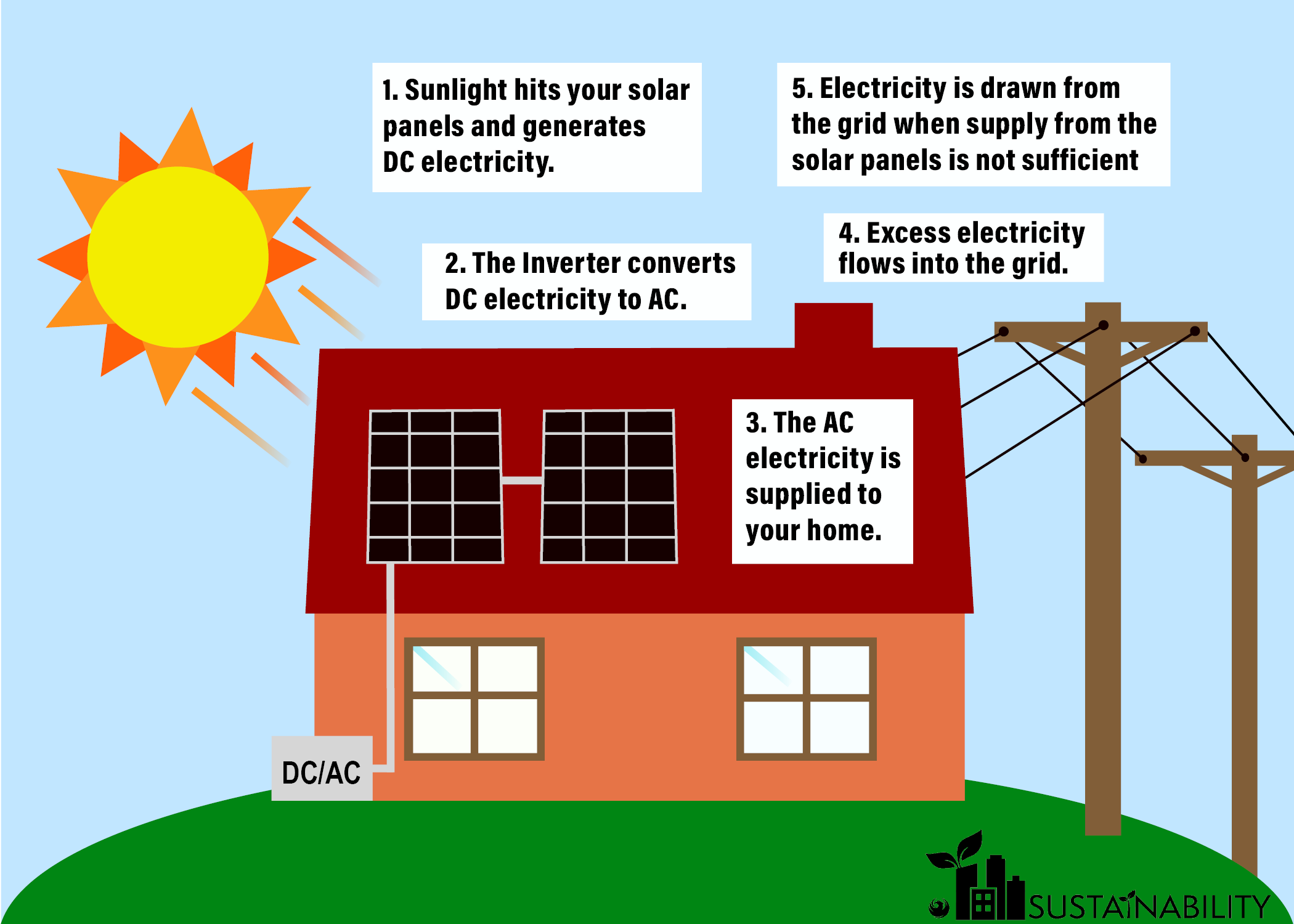 Solar panels convert sunlight into electricity, which an inverter transforms into usable power for homes and the grid.