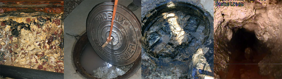 From left to right: Overloaded Grease Interceptor, Sewer Backup, Sewer Overflow Caused by FOG, and FOG Buildup in Sewer Line