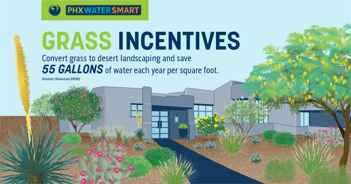 Choosing desert-adapted plants and watering them efficiently can greatly reduce customers’ water use. Phoenix non-residential​ customers can receive $2 per square foot of grass removed by converting to low water use, desert-adapted landscapes. ​