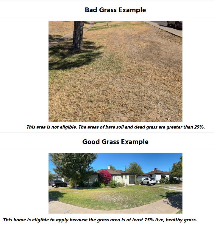 C) Two photos from different angles of the area of grass removal showing existing grass condition. Grass removal area must be at least 75% density of live, healthy grass. Before and after photos of previously removed grass does not count towards the minimum and is not eligible for the incentive. (See photo examples below).