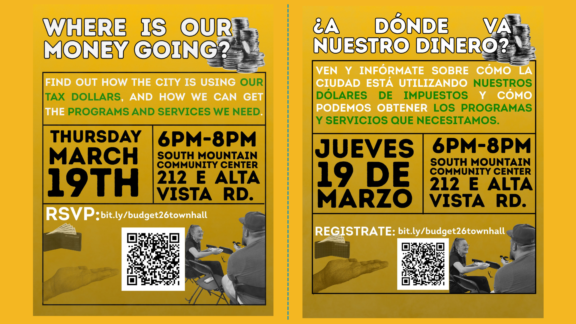 Acompañenos para aprender más sobre el presupuesto de la ciudad de Phoenix, la importancia de los presupuestos municipales en la lucha por nuestro bienestar y cómo podemos conseguir recursos y servicios concretos para nuestra comunidad. ¡Venga preparado con sus preguntas para Anna y listos para tomar accion!