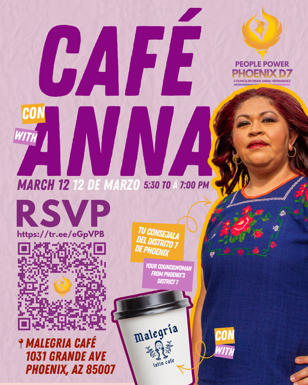 ¡Las mejores conversaciones pasan tomando un café! ☕ Acompáñame en Café con Anna en Malegría Latin Cafe cerca del centro de Phoenix, un espacio íntimo para conversar abiertamente con tus vecinos del Distrito 7 y apoyar a un pequeño negocio local. ¡Los espero con muchas ganas!